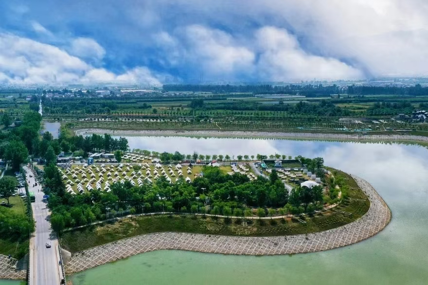 在涝河渼陂湖水系生态修复工程天桥湖区域,蓝天白云下,绿色草地与波光粼粼的湖面相互辉映。“这里交通便利,风景优美,露营设施完备,玩得特别开心。” 露营爱好者赵女士称赞道。