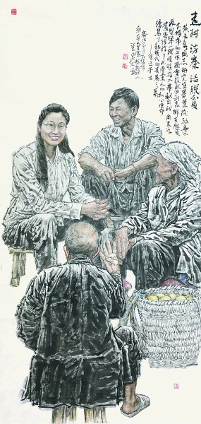 “重温黄文秀的事迹,一个个生动的镜头在我的脑海里浮现,一幅黄文秀不辞劳苦走遍百坭村的画面便已形成。”画家梁惠统创作的中国画《走村访寨话脱贫》,再现了黄文秀进村入户访贫问苦的场面。画面里,黄文秀朴素的衣着和温暖的笑容,乡亲们眼中的信赖和对新生活的向往,正是黄文秀这位泥泞中孕育出的跋涉者扎根基层、反哺家乡的最好写照。
