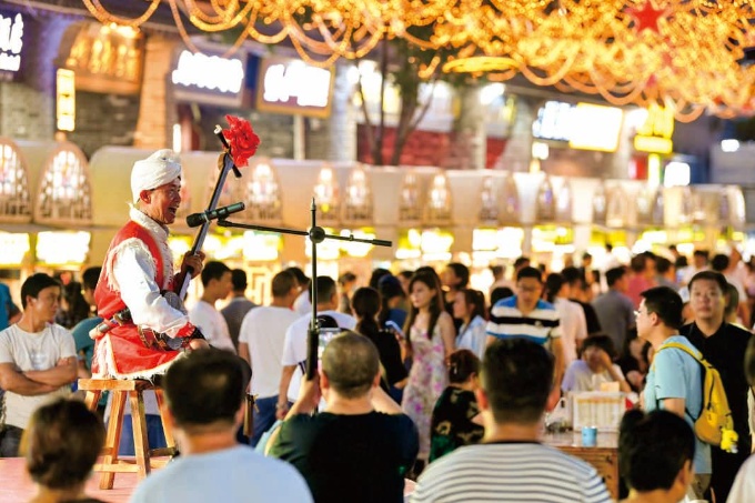 延安二道街演出的陕北说书,引过往游客驻足观赏。 冯雪峰/摄