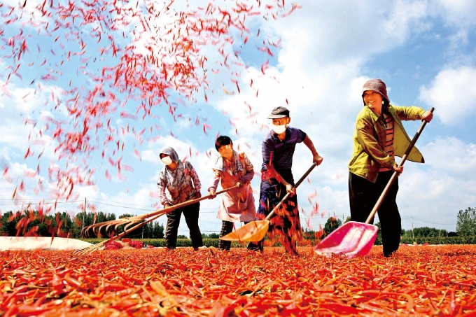 机器轰鸣,工人们将干辣椒运进加工车间,去杂、除尘、剪把、分拣,杜亚刚手握木锨,铲起一锨辣椒,发出“哗啦啦”的声音,上手抓一把,干脆紧实,辣香扑鼻。“籽和壳分得开,说明辣椒比较干,价好。”他对记者说,辣椒要“看、听、摸”,“干活就是一把锨,一手摸”。