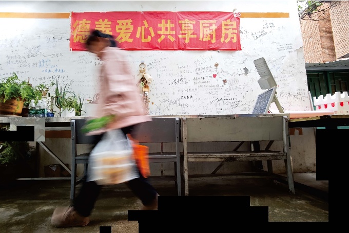 我顺着她的指引拐入一条街,果然看到前方一院子门口,“德善爱心共享厨房”几个黑色艺术字,如蜂蝶般舞动在墙壁,心下一喜,随即顺门而入。