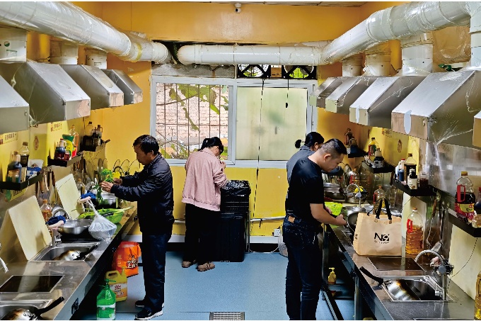 两排抽油烟机卫士般在厨房上空排布,俯瞰着一个个电磁炉、水龙头和调料台,米面油等物静置在厨房一角,锅一如既往般张着口等待被填满,他们你来我走,过往匆匆。