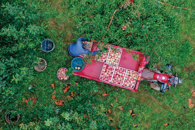 这秋淋可把王保军愁坏了。趁着天放晴,他连忙叫上几个邻居亲友开始采收苹果。六七个人都是摘果子的老把式,一进果园,不用专门分工,默契十足。女采下,男采上,腰不好的扶梯传递,另外两个搬运装车,一气呵成。