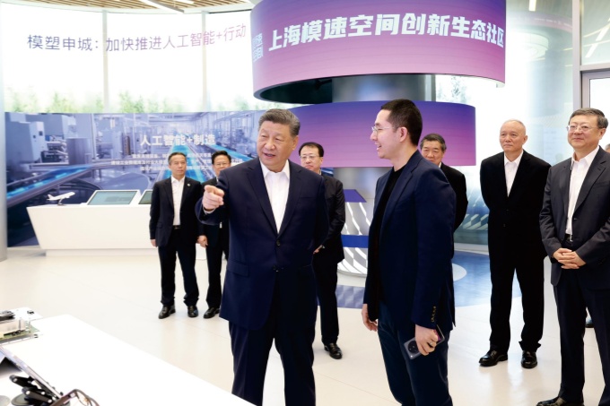 4月29日,中共中央总书记、国家主席、中央军委主席习近平在上海考察。这是习近平在位于徐汇区的上海“模速空间”大模型创新生态社区,察看大模型产品展示。新华社/供图