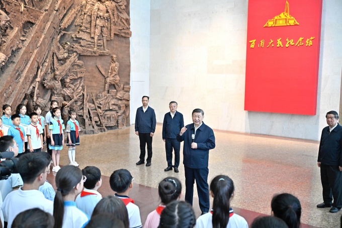 这是7日下午,习近平在位于阳泉市狮脑山的百团大战纪念馆考察时,同前来参观的青少年学生和纪念馆工作人员亲切交流。 新华社/供图