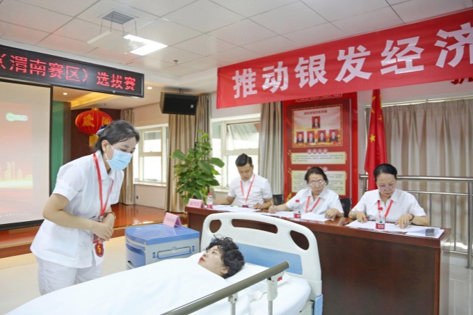临渭区杜桥医养中心,一名参赛的养老护理员在养老日常护理轮椅转换项目技能比赛中。