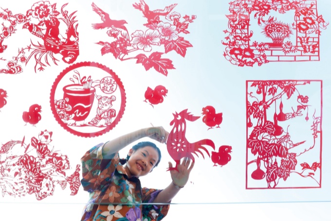 小朋友在张贴剪纸作品