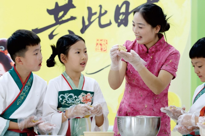 老师带领学生制作月饼