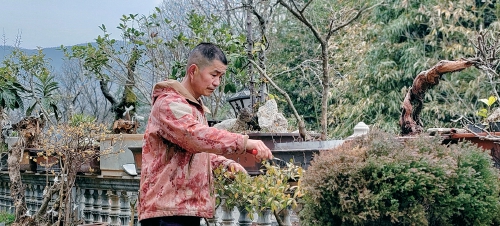 近日,陕西旬阳市段家河镇李家庄村村民向斌在自家小院里修剪盆栽。受访者供图