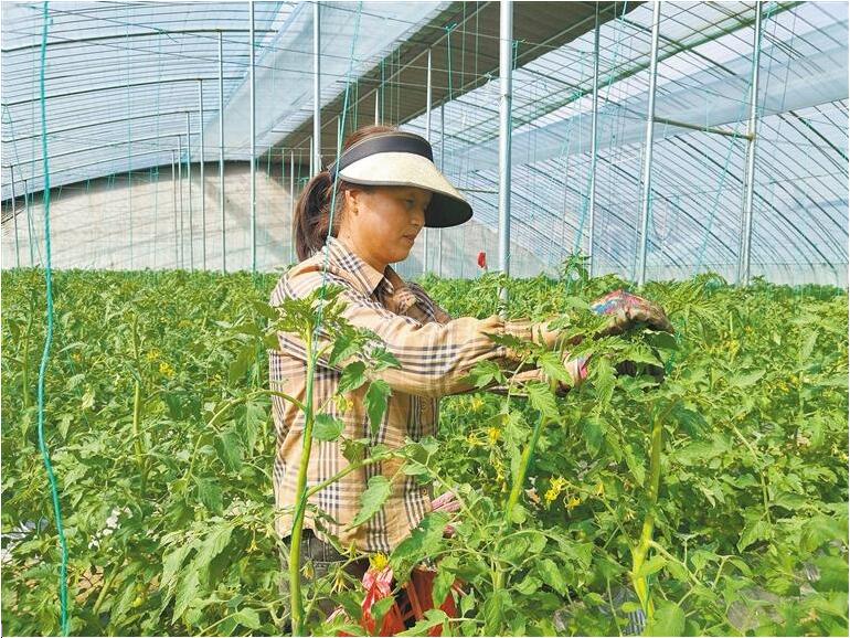 3月20日,在礼泉县昭陵镇肖东村的设施蔬菜大棚里,村民在给西红柿整枝。记者 刘居星摄