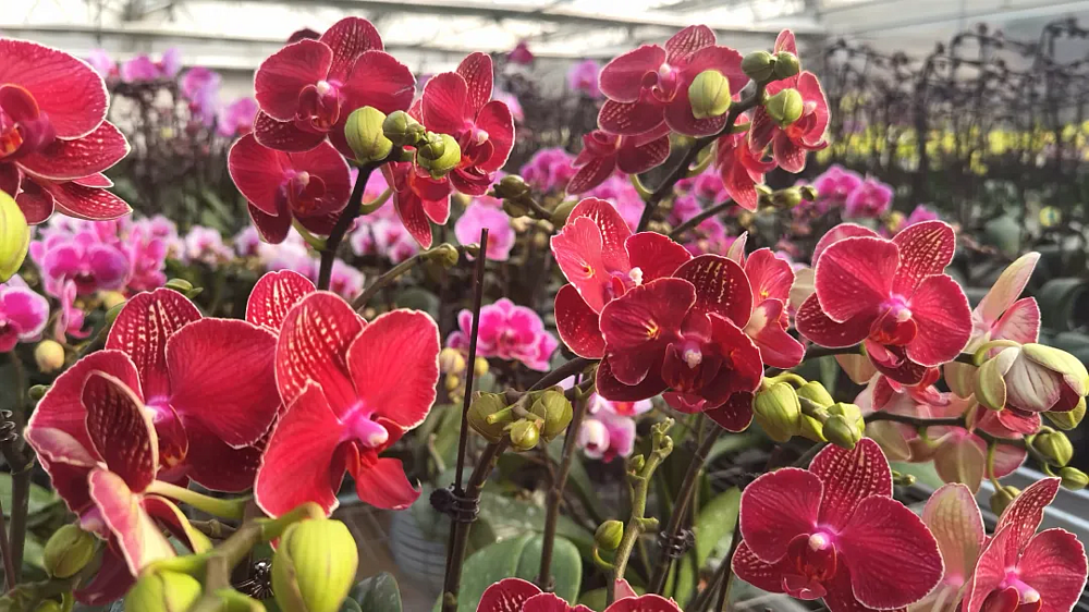 步入基地大棚,紫色、粉色、玫红色的蝴蝶兰亭亭玉立,花瓣舒展如振翅欲飞的蝴蝶,缤纷色彩交织成一片烂漫花海,浓郁花香沁人心脾。不同花色的植株被花农精心搭配造型,处处洋溢着生机勃勃的喜庆氛围。