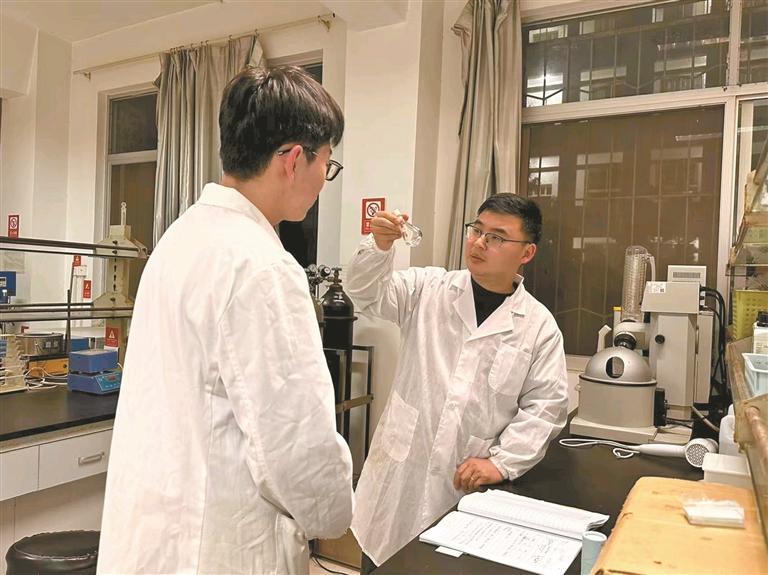 1月14日,王琦(右)在观察丹酚酸B镁盐的结晶情况。 受访者供图