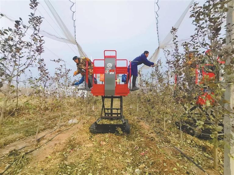 白水县农业技术人员在履带式升降作业平台上剪枝(资料照片)。 通讯员 董张曼摄