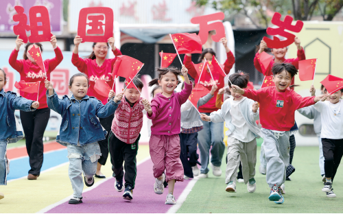 国庆、中秋双节将至,人们参加丰富多彩的活动,喜迎佳节。图为9月26日,山东省临沂市郯城县郯城街道官塘幼儿园的老师和孩子进行课间“快乐跑”。 新华社发(张春雷 摄)