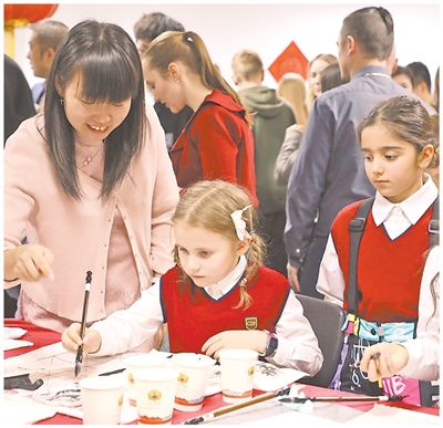 “同庆中国年 感受中国风”活动2月在俄罗斯莫斯科剑桥国际学校举行。图为该校学生在老师指导下体验中国书法。