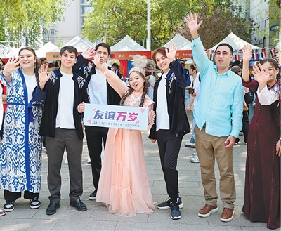 5月26日,中国石油大学(北京)第八届国际文化节在北京举行,中亚多国来华留学生设立国家文化及美食展台。图为中亚留学生在活动上合影留念。记者 陈尚文摄