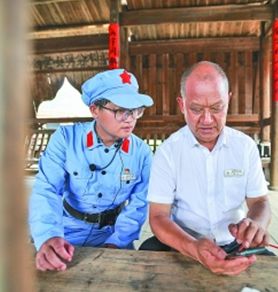 在福建长汀中复村红军桥,“红色讲解员”钟鸣(右)向儿子传授讲解经验。新华社发