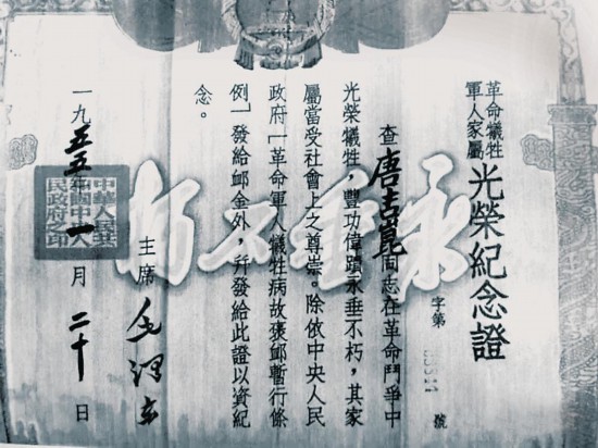 在丰满区退役军人事务局,有一本1955年由中华人民共和国主席毛泽东署名颁发的唐吉昆(即姚新一)烈士证书。姚新一的家人一直不知道烈士的情况,1948年末,辽沈战役后东北全境解放,他们热切地期盼英雄回家,1949年4月,由周保中签字王一知的复信告知了烈士牺牲的消息。姚新一不仅是周保中军长妻子王一知的恩师,也是周最为器重的战友之一。他曾评价姚新一“思想颖达酷肆革命文学,对马克思列宁学说理论有深心研究,工作活动甚敏活,对革命事业及工作担负常能刻苦艰忍”。