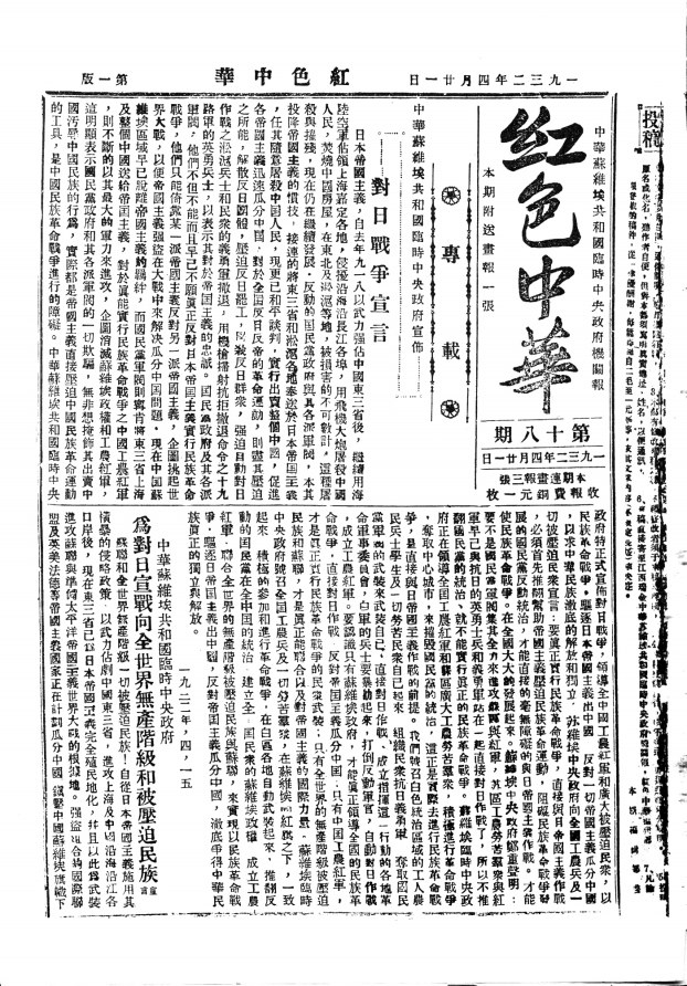1932年4月15日,由中华苏维埃共和国临时中央政府主席毛泽东亲自起草的《中华苏维埃共和国临时中央政府宣布对日战争宣言》(以下简称《对日战争宣言》)正式公开发布,并刊登在1932年4月21日出版的中华苏维埃共和国临时中央政府机关报《红色中华》上。这份《对日战争宣言》是红色政权首次以国家政权名义发布的抗日宣言,见证和讲述着中国共产党领导红色政权首擎抗日大旗、勇担民族大义的历史担当。