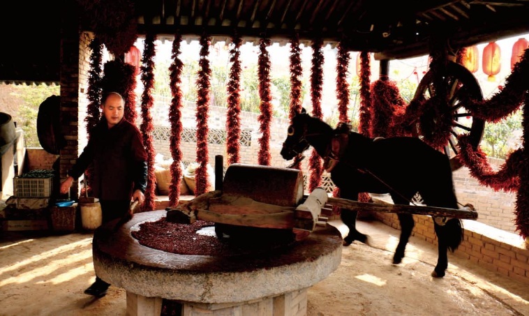 兴平市马嵬驿民俗文化村商户正碾辣子