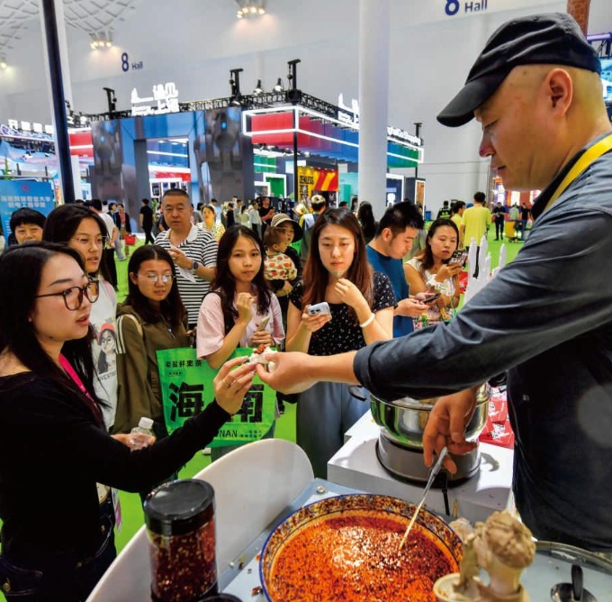参展者在第五届中国国际消费品博览会陕西展区内品尝兴平油泼辣子