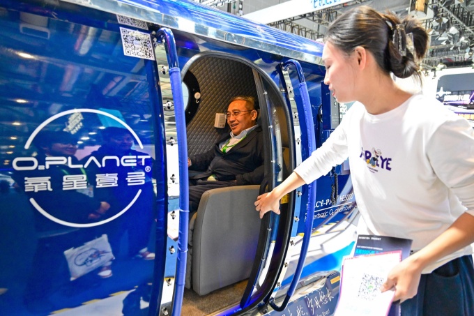 在进博会医疗器械及医药保健展区,一名观众体验一款适用于中老年群体的家用高氧舱。