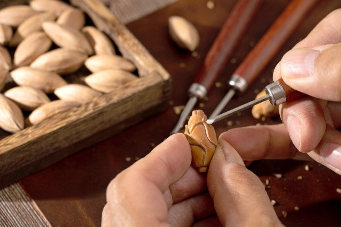 阳光透过玻璃窗落在她的工作台上,那些大大小小用于雕琢的刀具略显零落地摆放其上,一些未刻完的桃核。哦,或许它已经不能称为桃核,在锉刀刻下的那一刻,它们已经注定要成为一件艺术品。这些未完成的艺术品,正等着在她的主人精雕细琢之下完美地变身,而后享受世人的啧啧赞叹,那是它们最荣光的时刻,也是它们的主人,最幸福的时刻。那个戴眼镜的女人,纤细的手指捏起锥刀灵活地舞动着,每一刀落下都那般有力度。这力度只在刀尖,只在指尖,因而你在身边去看,那动作却是轻巧的,轻巧的甚至有些美丽。