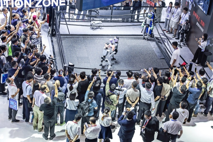 人形机器人进行格斗擂台赛