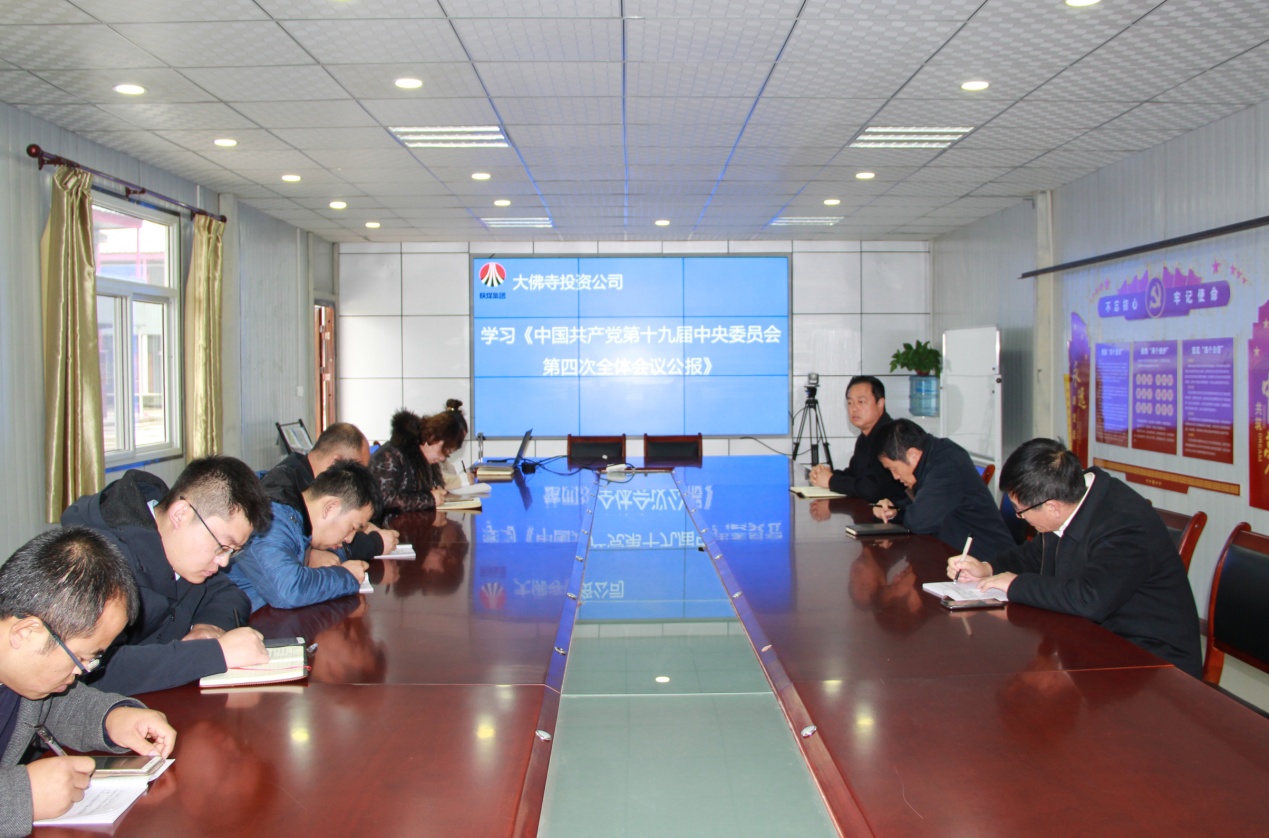大佛寺投资公司党支部组织全体党员干部召开主题党日学习会,专题学习《中国共产党第十九届中央委员会第四次全体会议公报》。该公司党支部要求党员干部要学深悟透、学懂弄通全会精神;切实强化制度意识,严格执行制度,坚决维护制度;要学用结合、以学促干,在推动各项工作落实上下功夫,把党的十九届四中全会精神转化为抓好省委巡视反馈意见、主题教育检视问题、基层党建突出问题等整改落实的强大动力,推动景区建设,促进企业高质量发展。