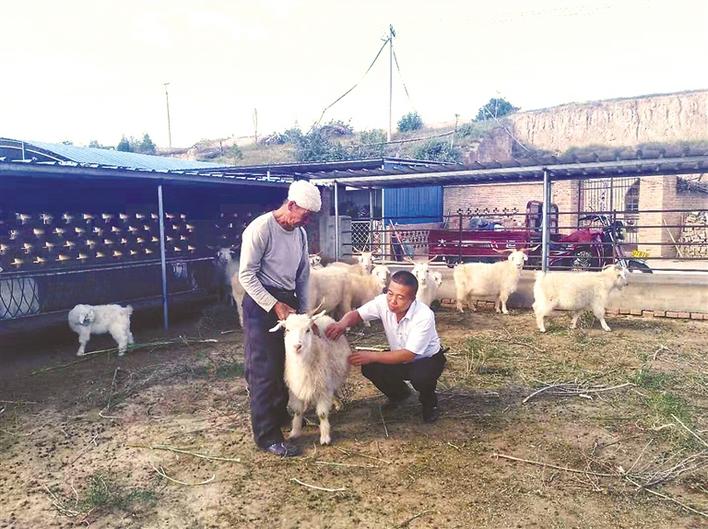 刘世东帮村民检查羊子的成长情况。 陕报记者 雷魏添摄