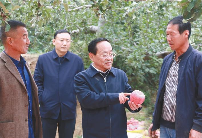 10月22日,蔺治斌(右二)走进果农苹果地里,了解苹果收获、销售等情况。