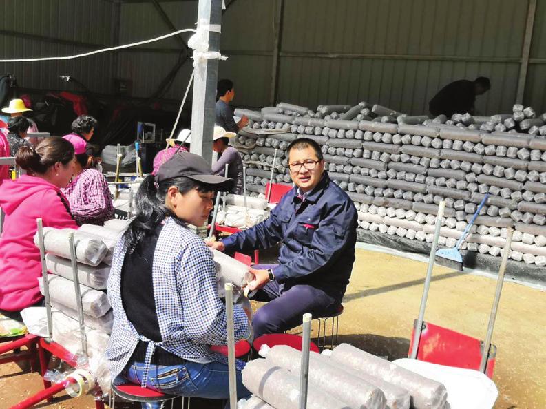 尹鹏先(右)参加香菇菌筒制作。
