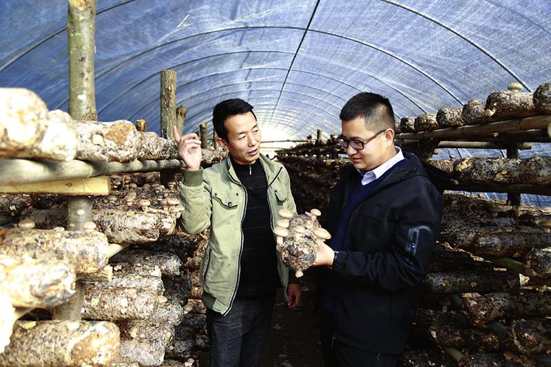 尹鹏先(右)查看袋料香菇。