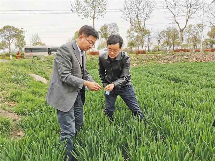 范九利(左)在田间地头了解农作物生长情况。 陕报记者 赵杨博摄
