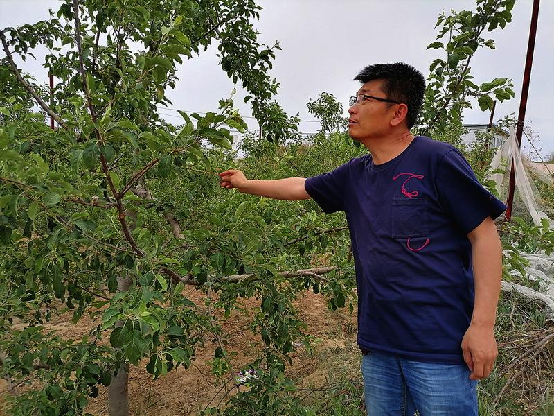 冷空气过后,常彦东正在查看山地苹果的受损情况。