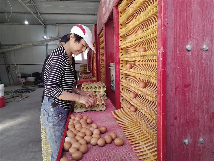五七村村民用自动收蛋机收取新鲜的鸡蛋。