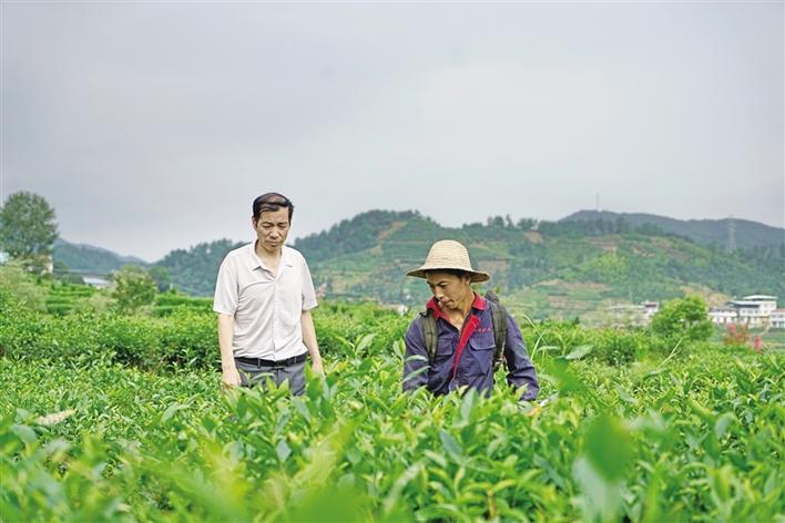 7月29日,紫阳县蒿坪镇蒿坪村第一书记储成新在茶叶产业园区与大家共同劳作。