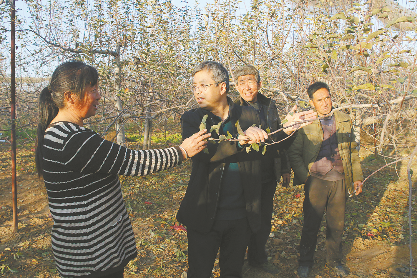 安沟镇党委书记卫关钰(左二)查看果树管理情况。
