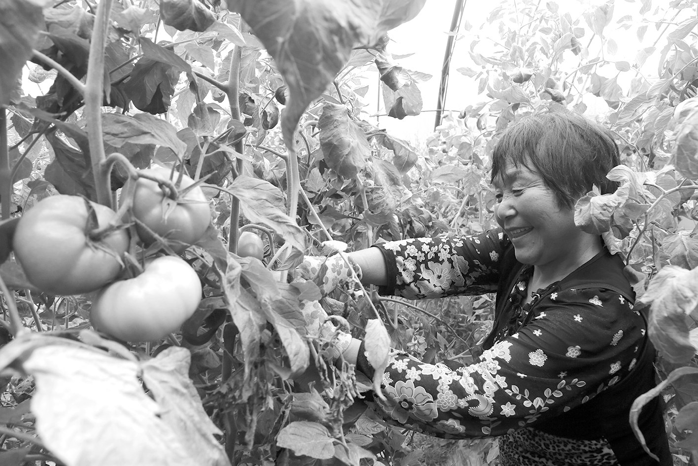 村民魏秀格在龙岩村大棚里采摘西红柿。