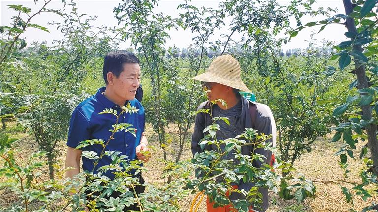 苗保岐(左)指导村民管护花椒。陕报记者 段承甫摄