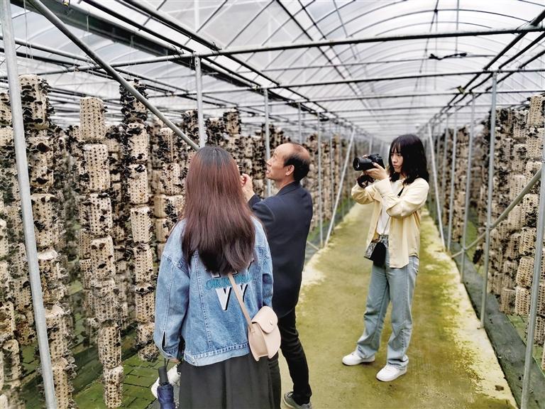 游客在村干部(中)带领下参观金米村木耳大棚,拍照留念。 陕报通讯员 郑卓然摄