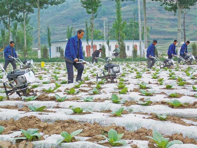 陇县盛大烤烟专业合作社微耕机服务队正在地里锄草松土,