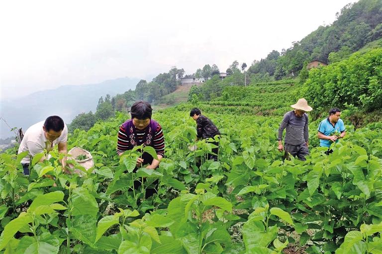 岚皋县堰门镇堰门村村民在桑园采摘桑叶。