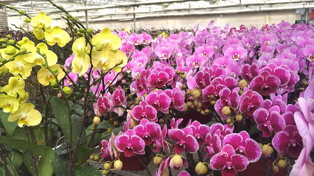 步入基地大棚,紫色、粉色、玫红色的蝴蝶兰亭亭玉立,花瓣舒展如振翅欲飞的蝴蝶,缤纷色彩交织成一片烂漫花海,浓郁花香沁人心脾。不同花色的植株被花农精心搭配造型,处处洋溢着生机勃勃的喜庆氛围。