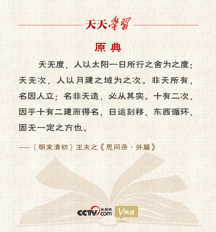 在《思问录·外篇》中,王夫之在谈论天文历法中的主观命名与客观对象的关系时,阐述了自己的名实观:“天无度,人以太阳一日所行之舍为之度;天无次,人以月建之域为之次。非天所有,名因人立;名非天造,必从其实。”意思是说,就自然的天而言,本没有“度”“次”之名,它们的得名仅仅是人们为了方便认识天象,把太阳每天运行所经过的地方叫作一度,把周天分成12等分,每月叫作一次。对于这些“人为之名数”,可以说“名因人立”;但从另一方面看,又是“名非天造,必从其实”,因为“人为之名数”不能凭空而造,必须以实际存在的事物为依据。