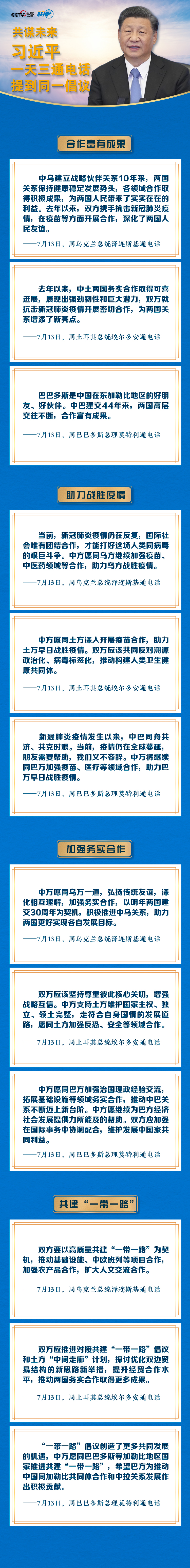 7月13日,习近平主席分别同乌克兰总统泽连斯基、土耳其总统埃尔多安、巴巴多斯总理莫特利通电话。在通话中,习主席分别与三国领导人忆往昔、言现在、话未来,就新冠肺炎疫情、务实合作、“一带一路”倡议等共同关心的话题交换了意见。