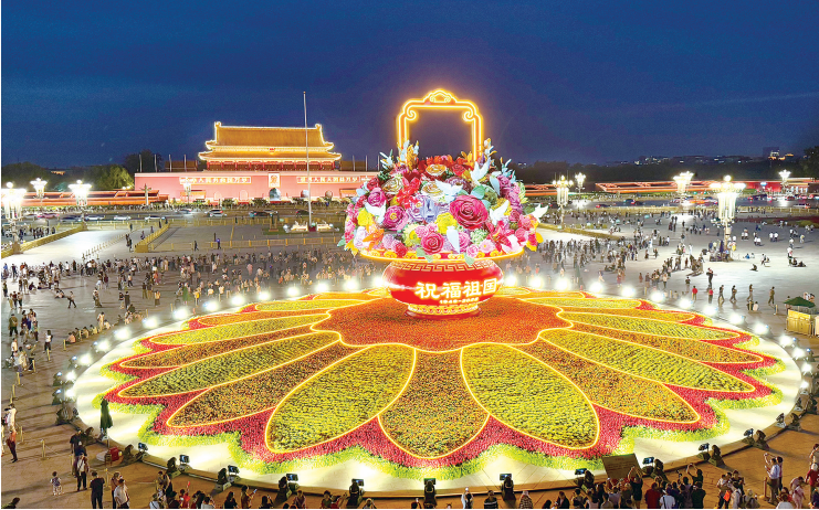 近日,天安门广场中心“祝福祖国”大花篮亮相。大花篮里灵动的鸽子展翅欲飞,与篮中满载的鲜花相映成趣,共同勾勒出一幅和平发展、欣欣向荣的时代画卷。图为近日在天安门广场拍摄的“祝福祖国”大花篮夜景。 新华社发