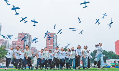 江苏省宿迁市泗洪县新星城西学校,学生们在放飞飞机模型。