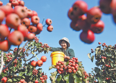 山东省淄博市沂源县悦庄镇崔家庄村,农民在采摘山楂。