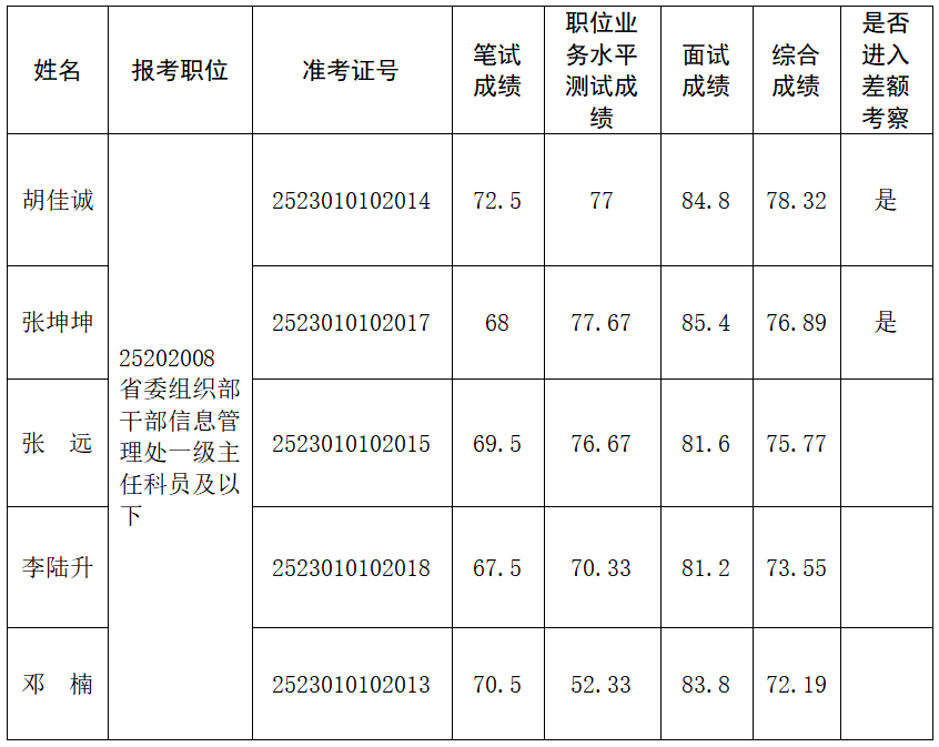 按照《陕西省2025年省级机关公开遴选公开选调公务员公告》规定,现将省委组织部机关公开遴选职位进入面试人员笔试成绩、职位业务水平测试成绩、面试成绩、综合成绩,以及进入差额考察人员情况予以公告。请进入差额考察的考生保持联系方式畅通。
